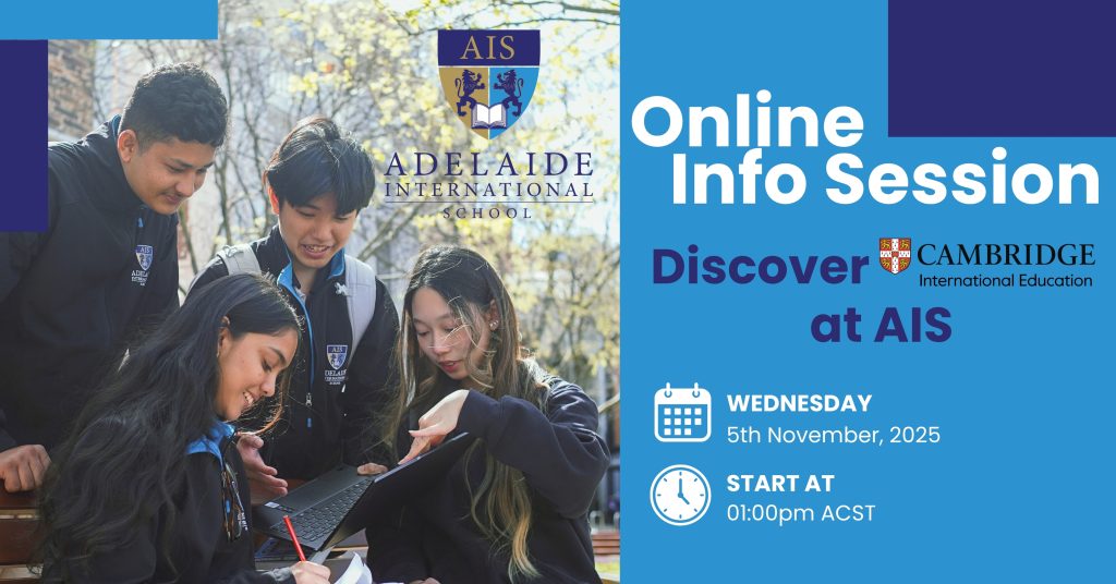 Adelaide International School invites families, agents, and prospective students to an Online Information Session exploring our Cambridge IGCSE and A Level programs.